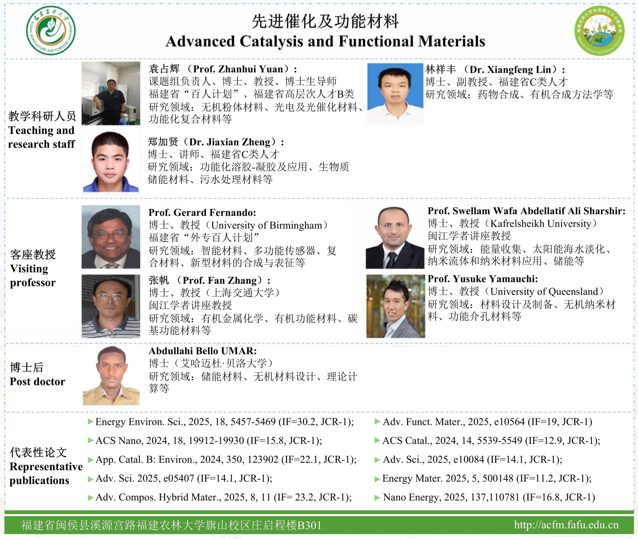 先进催化及功能材料团队始建于2015年,是福建农林大学重点支持和建设的科研团队之一。本团队结合福建农林大学材料工程学院生物质材料研究的优势,与当代先进的无机粉体材料、光电和光催材料和天然高分子材料多学科交叉结合,并针对二维晶体材料、功能化高分子复合材料的制备及其在新型清洁能源、化工、航空航天等领域的应用展开研究工作。