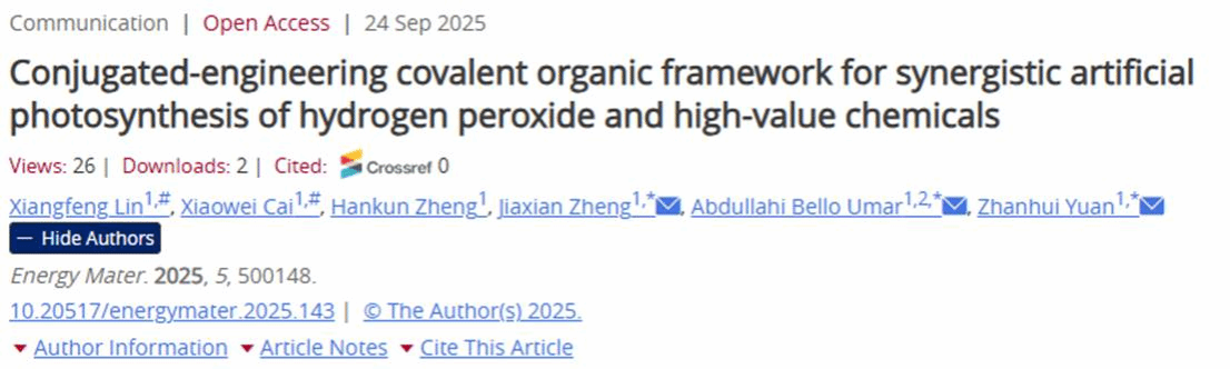近日,福建农林大学材料工程学院袁占辉教授团队在国际知名期刊Energy Materials (JCR 1区,影响因子11.2)上,在线发表了题为“Conjugated-engineering covalent organic framework for synergistic artificial photosynthesis of hydrogen peroxide and high-value chemicals”的创新性研究论文。福建农林大学为第一通讯单位。福建农林大学林祥丰副教授与硕士研究生蔡晓慰为共同第一作者。福建农林大学袁占辉教授、Abdullahi Bello Umar博士和郑加贤博士为共同通讯作者。