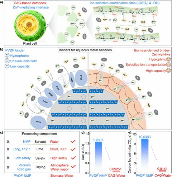 二次水系金属电池因其安全、低成本和环境友好引起了广泛的关注。聚偏氟乙烯(PVDF)是水系电池正极材料制备过程的常用粘结剂。然而,PVDF依靠弱范德华力来粘合活性材料和集流体,导致其在循环过程中结构稳定性不足。其次,在水系电解质环境中,PVDF的疏水性阻碍了电解液的有效渗透以及与正极材料的接触,降低了正极活性材料的利用率和电池容量。此外,PVDF粘结剂加工过程需要使用有机溶剂(N-甲基吡咯烷酮),这给水系电池正极制备的成本、安全性和环保性带来了额外的挑战。因此,粘结剂对于水系电池的性能和加工成本有重要的影响。
